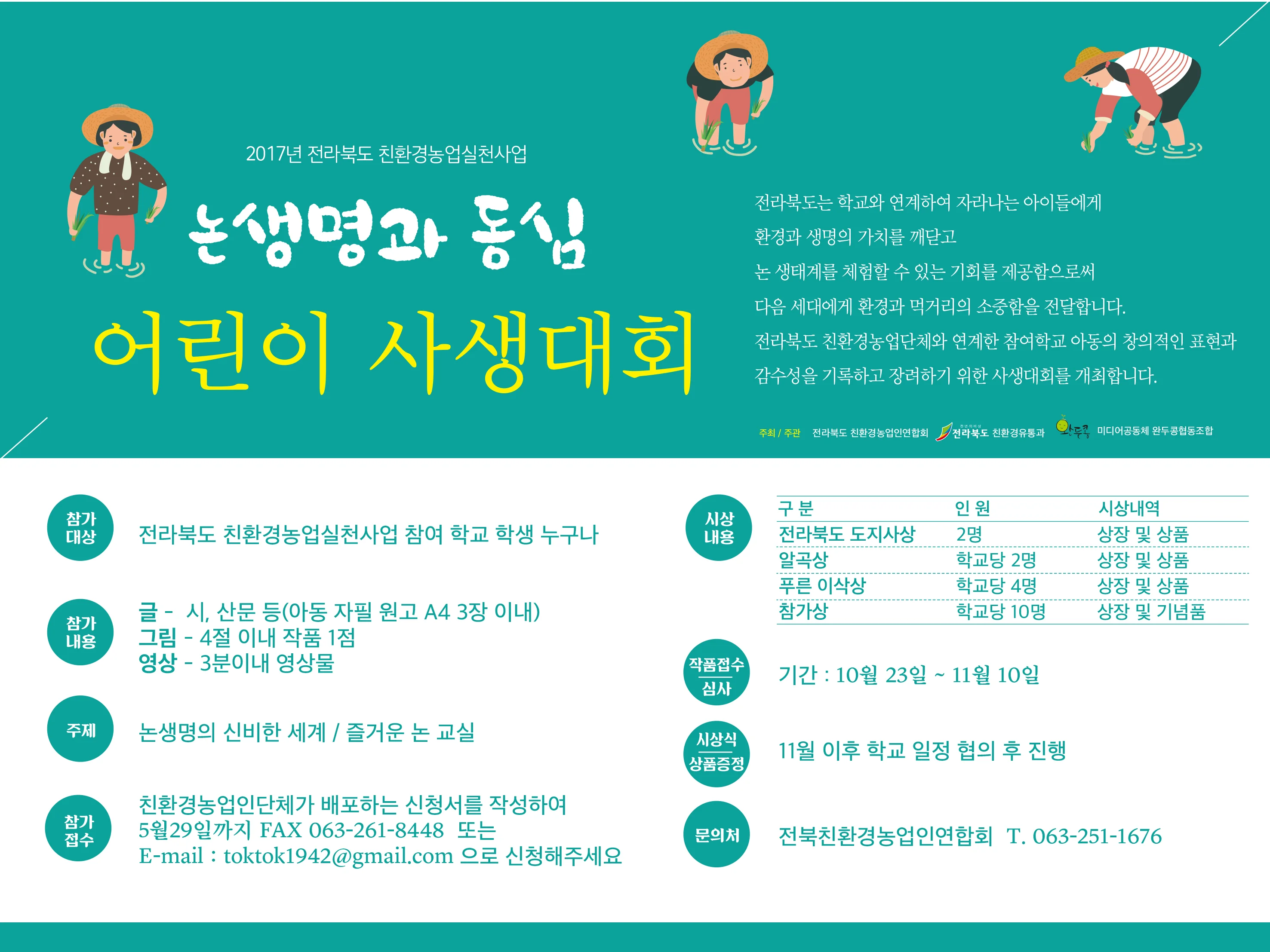 전라북도 친환경농업인연합회와 전라북도 친환경유통과가 주최하고 완두콩이 주관하는 '2017 전라북도 친환경농업실천사업 <논생명과 동심 어린이 사생대회>'가 열립니다.
